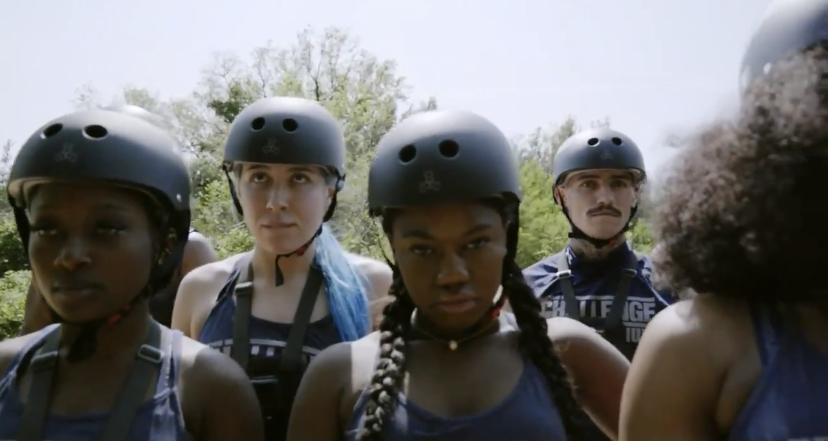 Renan and Michaela vs Corey and Michele goes down with teams strapped back to back using whatever they can to get the other team off the ramp with them first.