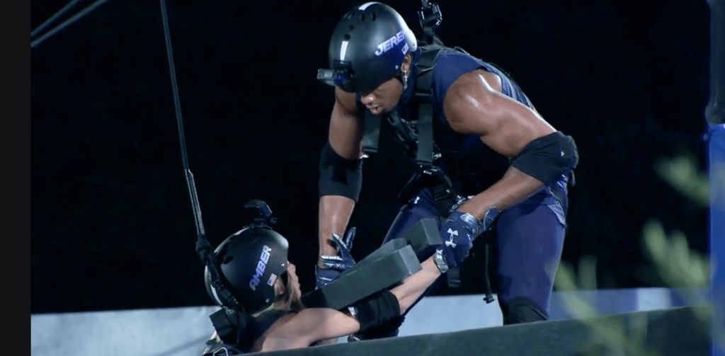 Its a puzzle…Cory is rightfully stressed about this. Teams must carry puzzle pieces from one side to the other along an uneven balance beam.