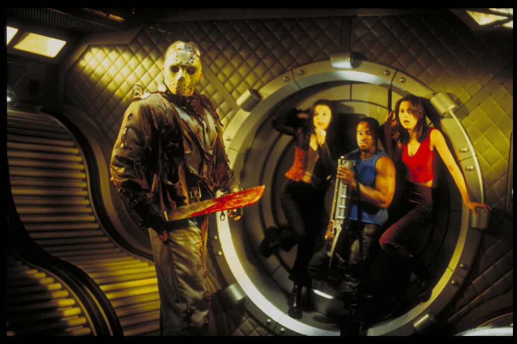 Yes, I said it. Jason. In. SPACE. This isn’t horror—it’s intergalactic camp couture. He gets frozen, wakes up in the year 2455, and becomes Uber Jason. Its so fucking funny.